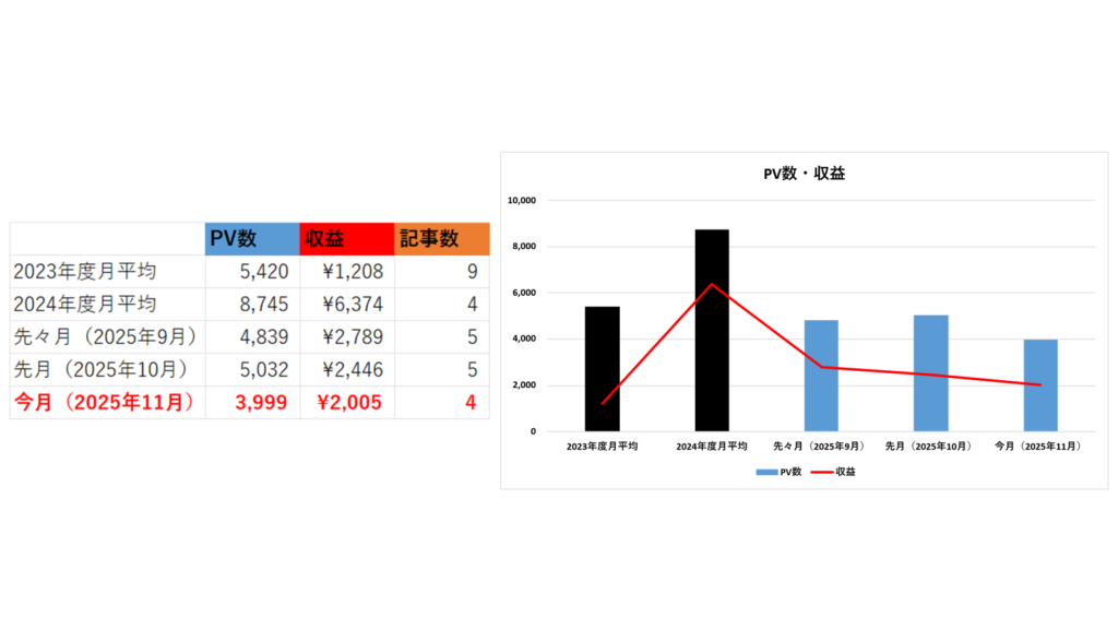 今月のPV数は3,999PV、収益は¥2,005(推定含む)、記事数は4記事だった。