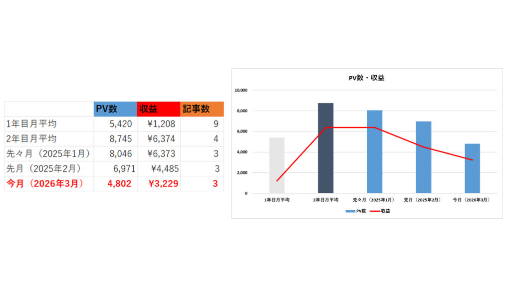 今月のPV数は4,802PV、収益は¥3,229(推定含む)、記事数は3記事だった。