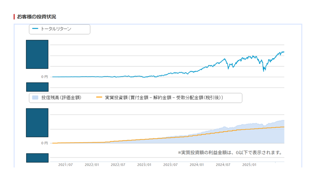 現在保有している主要銘柄は楽天・プラス・オールカントリー株式インデックス・ファンド(楽天・プラス・オールカントリー)、リターンは以下のような感じ(一部割愛)。